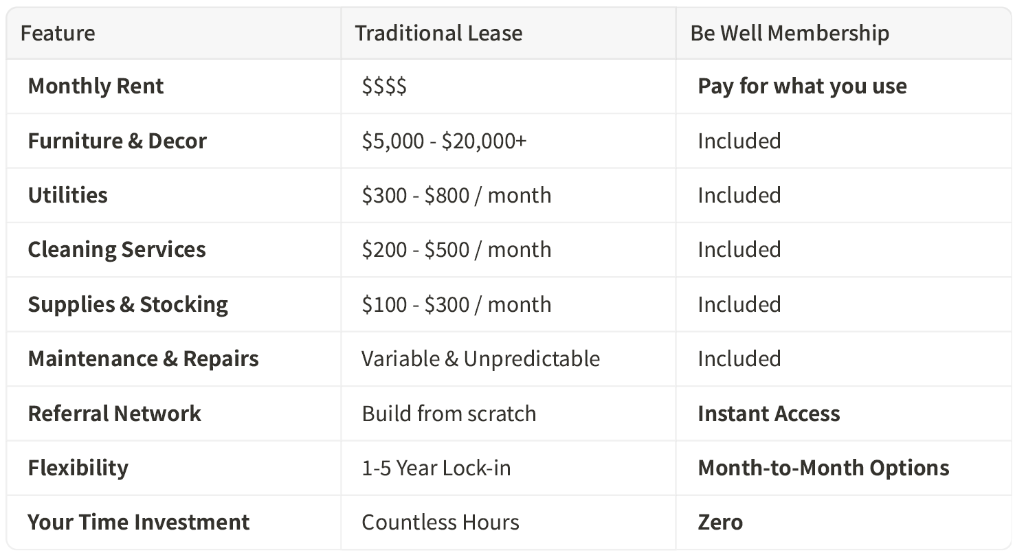 Be Well offers a flexible, cost-effective way to grow your practice, test new markets, and serve more clients—all without the burden of a long-term lease.
