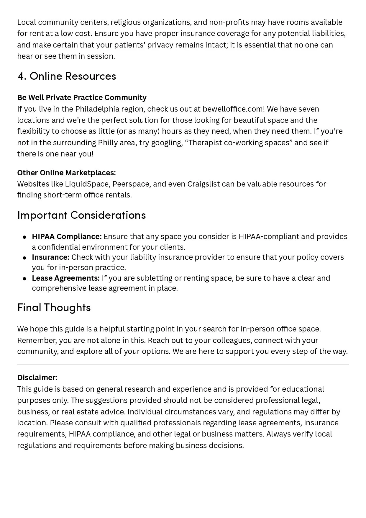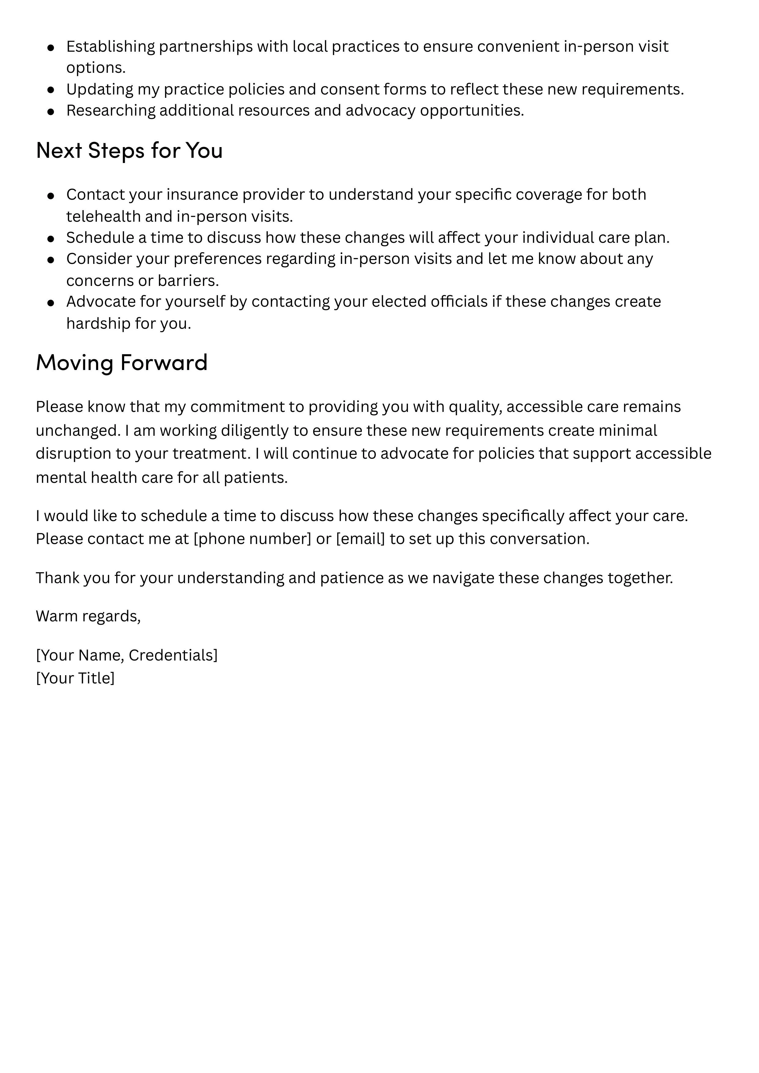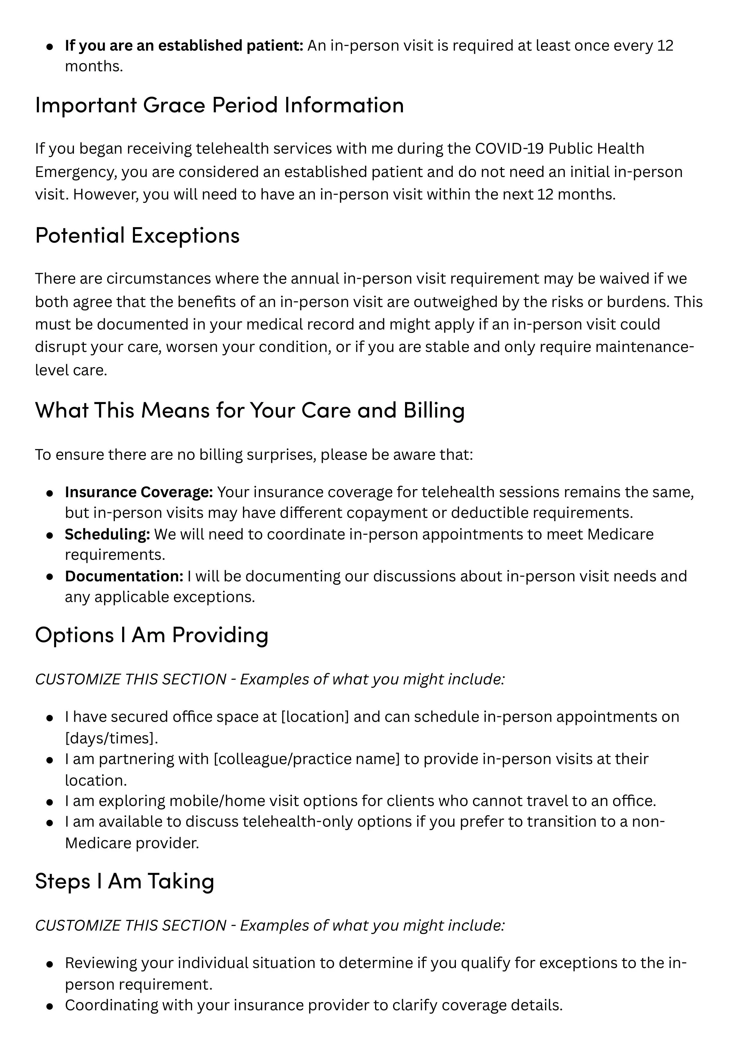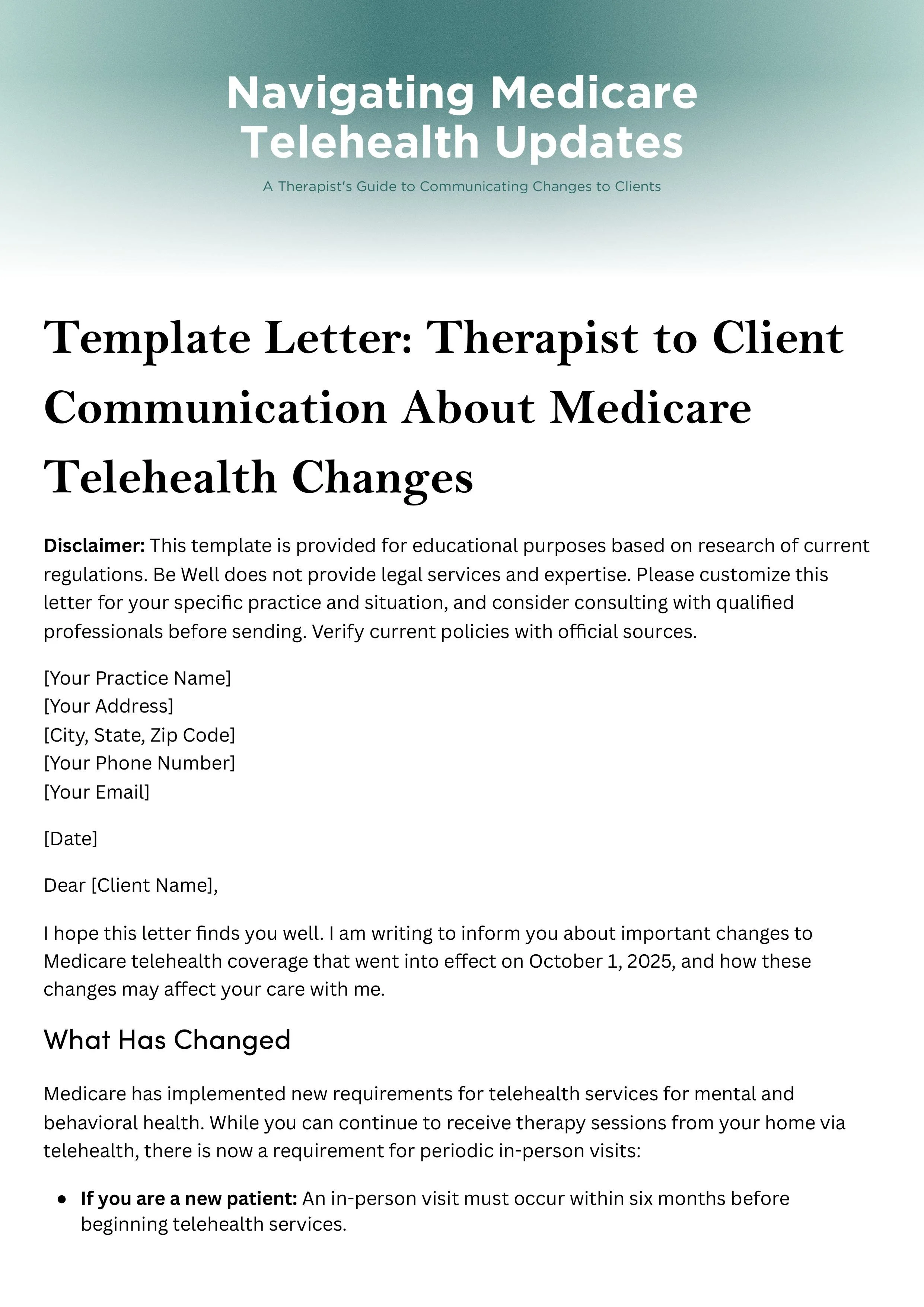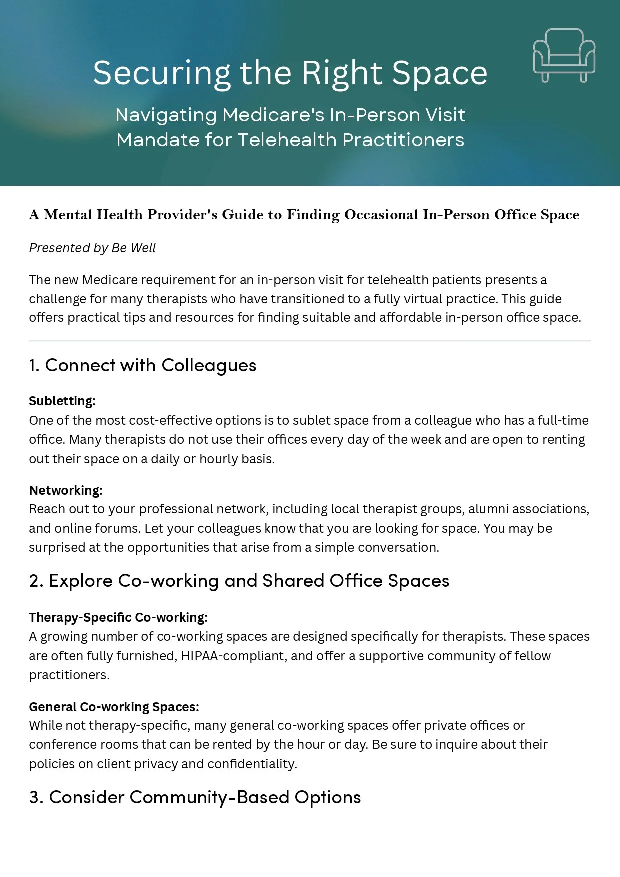 Navigating the New Medicare Telehealth Rules: Resources for Therapists Medicare Telehealth Fact Sheet A Therapist's Guide to Finding In-Person Office Space Template Letter for Client Communication